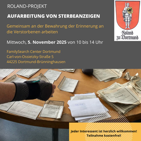 Für dieses Roland-Projekt benötigen wir immer viele fleißige Hände und würden uns sehr darüber freuen, Sie zu dieser Veranstaltung im FamilySearch Center in Dortmund-Brünninghausen begrüßen zu dürfen.